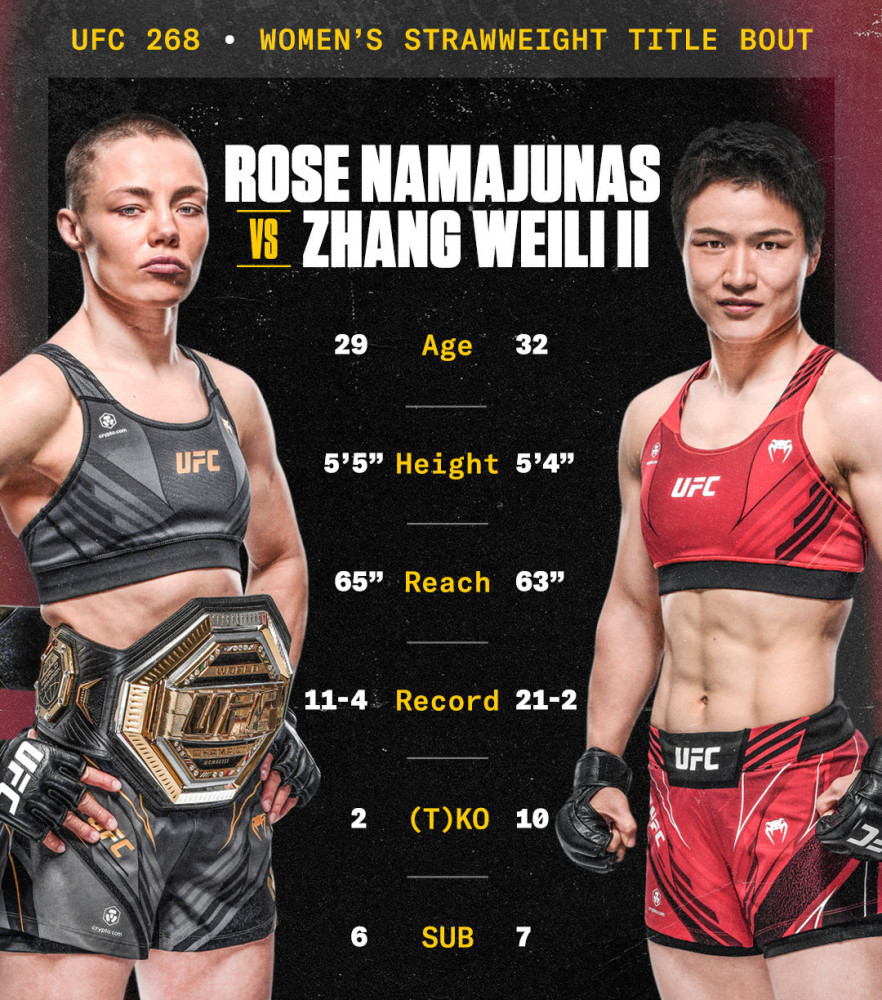 北京时间11月7日,UFC 268在纽约麦迪逊花园广场进行,张伟丽迎来了与现任冠军罗斯的二番战,同时也是草量级的冠军争夺战。在经过5回合激战后,裁判分歧判定,罗斯击败张伟丽,张伟丽无缘在美国客场重夺UFC草量级世界金腰带。