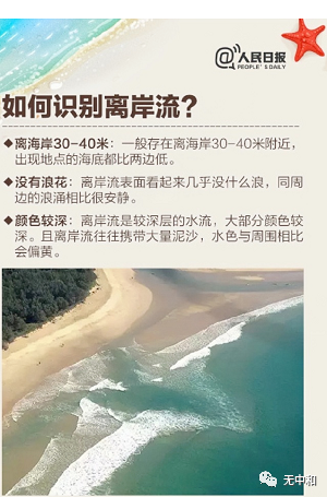 由于离岸流流速极快,而且表面平静,不易发觉,只需几秒钟,它就能将岸边的游泳者带到外海区域,危险性极大。