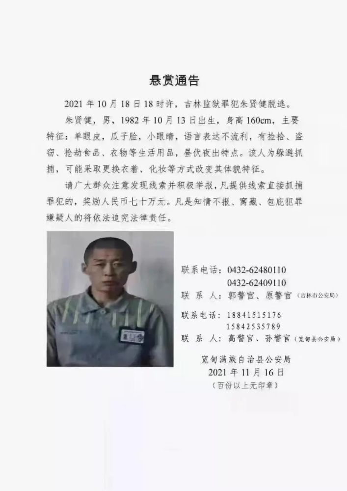 11月18日,一份显示11月16日印发,署名为宽甸满族自治县公安局的悬赏缉拿越狱犯朱贤健的通告被转发至网络。其中提到凡提供线索直接抓捕罪犯的,奖励70万元。