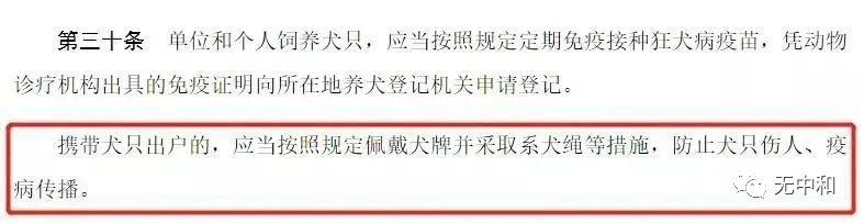 「携带犬只出户的,应当按照规定,佩戴犬牌并采取系犬绳等措施」。