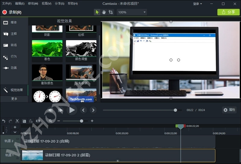 TechSmith Camtasia 2022 中文破解版是一款屏幕录像软件及视频编辑软件.这套强大的专业高清录屏软件与视频创作软件套装包含捕获屏幕录制,视频剪辑和视频编辑,视频录音配音,视频菜单创作,视频剧场等功能.